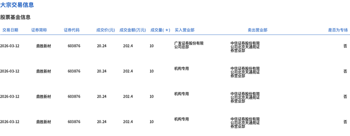 3月12日,鼎胜新材大宗交易成交140万股,成交额2833.6万元,占当日总成交额的2.84%,成交价20.24元,较市场收盘价21.53元折价5.99%。