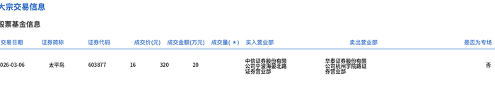 3月6日,太平鸟大宗交易成交20万股,成交额320万元,占当日总成交额的11.84%,成交价16元,较市场收盘价15.39元溢价3.96%。