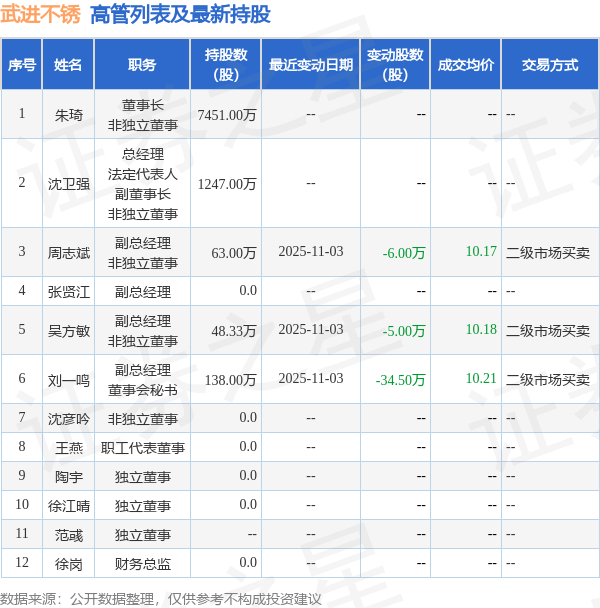 武进不锈:11月3日高管周志斌、吴方敏、刘一鸣减持股份合计45.5万股
