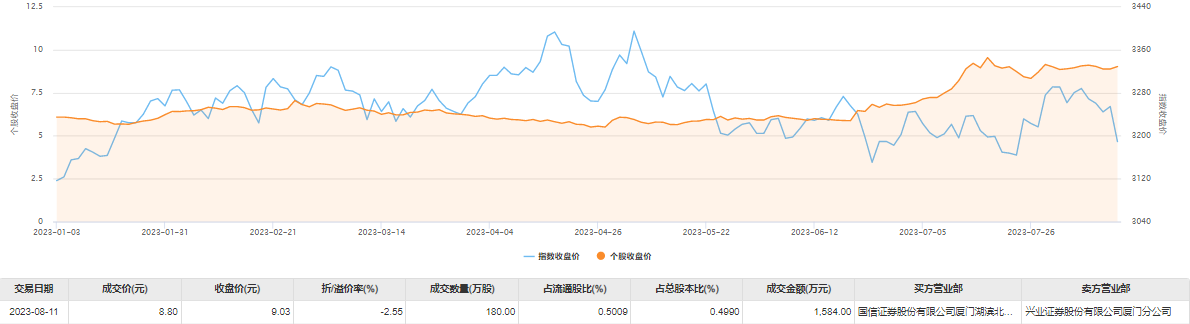 今日大宗交易成交180万股,成交额1584万元,占当日总成交额的14.08%,成交价8.8元,较市场收盘价折价2.55%。