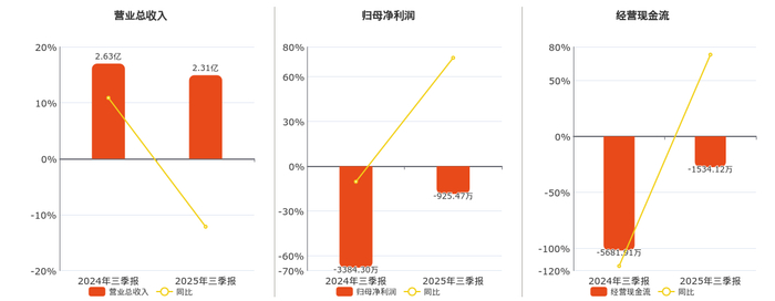 公司营业总收入为2.31亿元,在已披露的同业公司中排名第73,较去年同报告期营业总收入减少3192.17万元,同比较去年同期下降12.15%。归母净利润为-925.47万元,在已披露的同业公司中排名第65。经营活动现金净流入为-1534.12万元,在已披露的同业公司中排名第54。