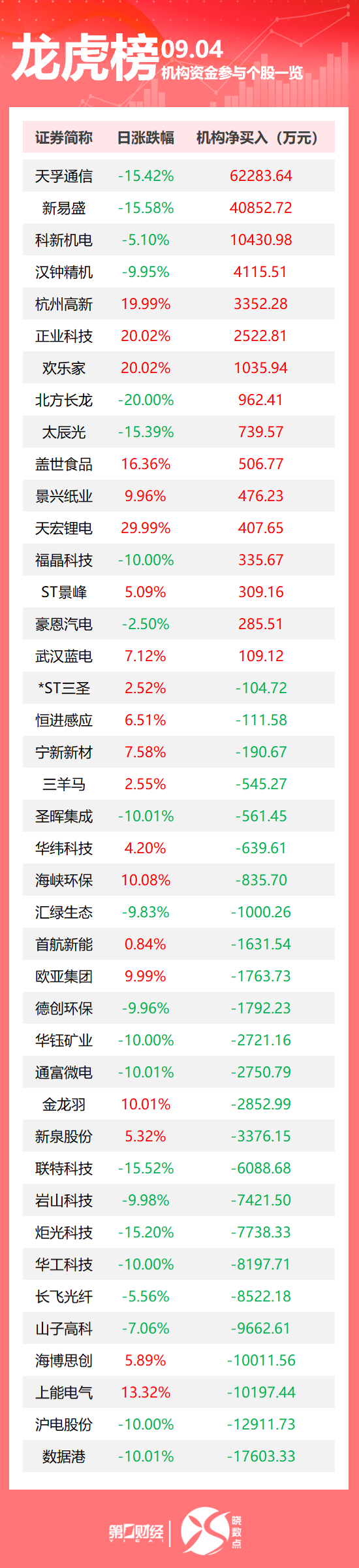 当天机构净买入前三的股票分别是天孚通信、新易盛、科新机电,净买入金额分别是6.23亿元、4.09亿元、1.04亿元。