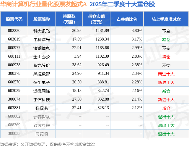 华商计算机行业量化股票发起式A的前十大重仓股如下: