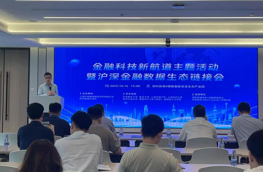 2025年10月16日,上海市金融数据港开发有限公司与深圳数据交易所联合主办的“金融科技新航道主题活动暨沪深金融数据生态链接会”在深圳成功举办。此次活动是金融数据港品牌系列活动“Fintech-Plus”的又一次重要外延,标志着金融数据港在推动跨区域金融科技协同、构建数据驱动创新生态方面迈出重要一步。