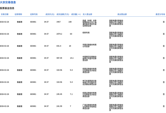 2月26日,数据港大宗交易成交227万股,成交额7847.4万元,占当日总成交额的2.18%,成交价34.57元,较市场收盘价39.79元折价13.12%。
