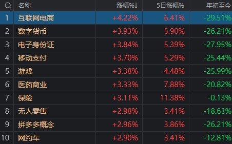 板块方面,电商、移动支付、医药商业、网约车等板块涨幅居前,电池、煤炭、染料、折叠屏等板块跌幅居前。