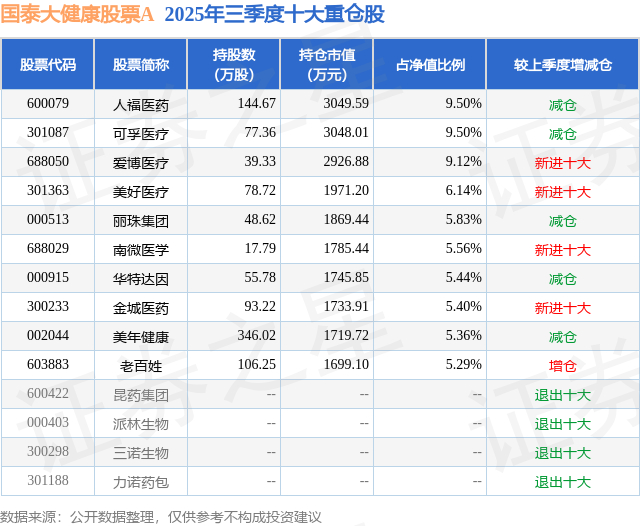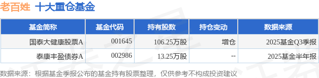 根据2025基金Q3季报公募基金重仓股数据,重仓该股的公募基金共1家,其中持有数量最多的公募基金为国泰基金的国泰大健康股票A。国泰大健康股票A目前规模为3.03亿元,最新净值2.036(12月30日),较上一交易日上涨0.49%,近一年上涨2.52%。该公募基金现任基金经理为徐治彪。徐治彪在任的基金产品包括:国泰研究精选两年持有混合,管理时间为2019年12月24日至今,期间收益率为160.19%;国泰金鹰增长混合,管理时间为2020年7月24日至今,期间收益率为9.34%;国泰价值经典混合(LOF),管理时间为2020年7月24日至今,期间收益率为28.85%。