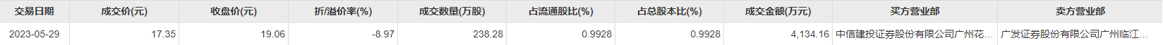 5月29日大宗交易成交238.28万股,成交额4134.16万元,占当日总成交额的60.72%,成交价17.35元,较市场收盘价19.06元折价8.97%。