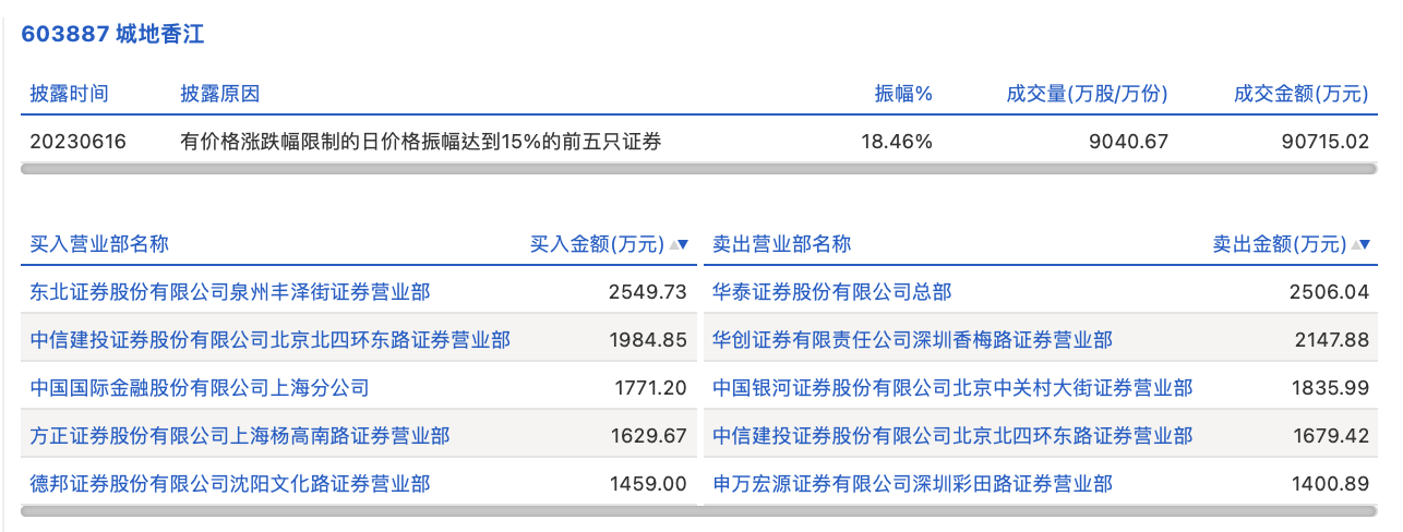 6月16日,城地香江今日涨停,龙虎榜数据显示,上榜营业部席位全天成交1.9亿元,占当日总成交金额比例为20.91%。其中,买入金额为9394.44万元,卖出金额为9570.21万元,合计净卖出175.77万元。