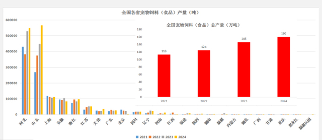 中国饲料工业协会数据显示,2024年全国宠物饲料(主粮)产量达160万吨,比五年前增长66.7%,连续多年保持两位数增长。2025年前7个月,产量达100.6万吨,同比增长14.5%。