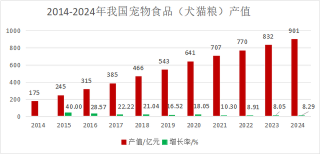 中国农业科学院饲料研究所宠物营养团队数据统计显示,2024年我国宠物犬猫饲养量达1.4亿只,宠物产业总规模突破3000亿元,其中宠物食品市场占比最高。到2024年,宠物食品犬猫粮市场规模达到900亿元,比2023年增长8.3%。