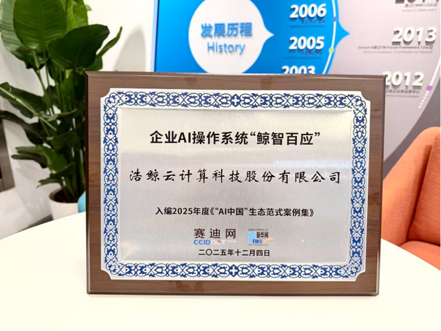 在核心平行论坛——“AI中国”生态范式论坛上,浩鲸科技重磅打造的企业AI操作系统“鲸智百应”凭借领先理念和创新能力,成功入选《“AI中国”生态范式案例集》行业典范;浩鲸科技全栈AI技术实力获赛迪智库《2025“人工智能+”产业生态全景图谱》权威认证。