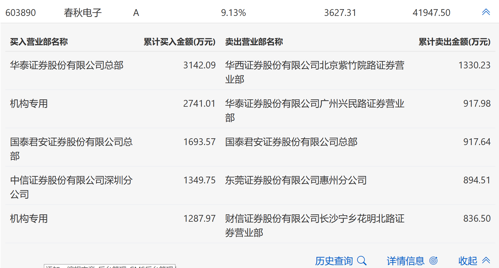 11月6日,春秋电子今日涨停,全天换手率达8.26%,振幅达10.22%。龙虎榜数据显示,营业部席位合计净买入5317.55万元。其中,机构合计净买入4028.99万元。此外,华泰证券总部、国泰君安证券总部分别买入3142.09万元、1693.57万元;华西证券北京紫竹院路证券营业部、华泰证券广州兴民路证券营业部分别卖出1330.23万元、917.98万元。