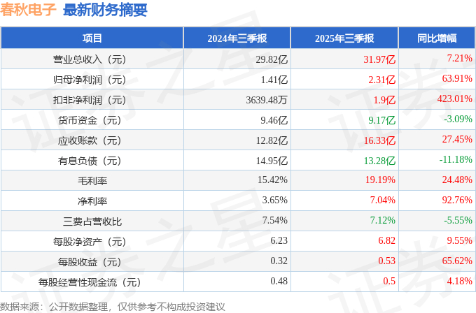 据证券之星公开数据整理,近期春秋电子(603890)发布2025年三季报。截至本报告期末,公司营业总收入31.97亿元,同比上升7.21%,归母净利润2.31亿元,同比上升63.91%。按单季度数据看,第三季度营业总收入12.71亿元,同比上升15.0%,第三季度归母净利润1.38亿元,同比上升20.61%。本报告期春秋电子盈利能力上升,毛利率同比增幅24.48%,净利率同比增幅92.76%。