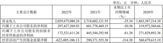 2022年,瑞芯微实现营业收入20.30亿元,同比减少25.34%;归属于上市公司股东的净利润2.97亿元,同比减少50.58%;归属于上市公司股东的扣除非经常性损益的净利润1.73亿元,同比减少61.28%;经营活动产生的现金流量净额为-6.22亿元,同比减少314.38%。