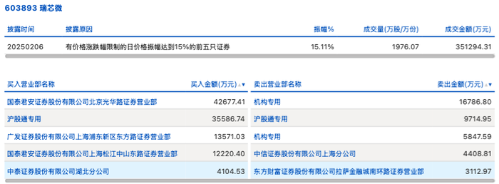 2月6日,瑞芯微今日涨停,龙虎榜数据显示,上榜营业部席位全天成交14.8亿元,占当日总成交金额比例为42.14%。其中,买入金额为10.82亿元,卖出金额为3.99亿元,合计净买入6.83亿元。