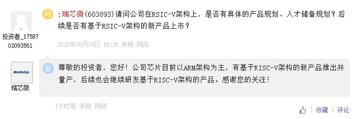 【V观财报丨瑞芯微:基于RISC-V架构的产品已量产】瑞芯微17日通过上证e互动平台回答投资者提问称,公司芯片目前以ARM架构为主,有基于RISC-V架构的新产品推出并量产,后续也会继续研发基于RISC-V架构的产品。(中新经纬APP)