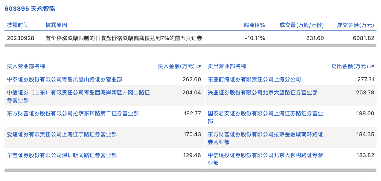 9月28日,天永智能今日跌停,全天换手率达2.14%,振幅达0%。龙虎榜数据显示,营业部席位合计净卖出97.95万元。其中,东亚前海证券上海分公司、兴业证券北京大望路证券营业部分别卖出277.31万元、203.78万元;中泰证券青岛凤凰山路证券营业部、中信证券(山东)青岛西海岸新区井冈山路证券营业部分别买入262.60万元、204.04万元。