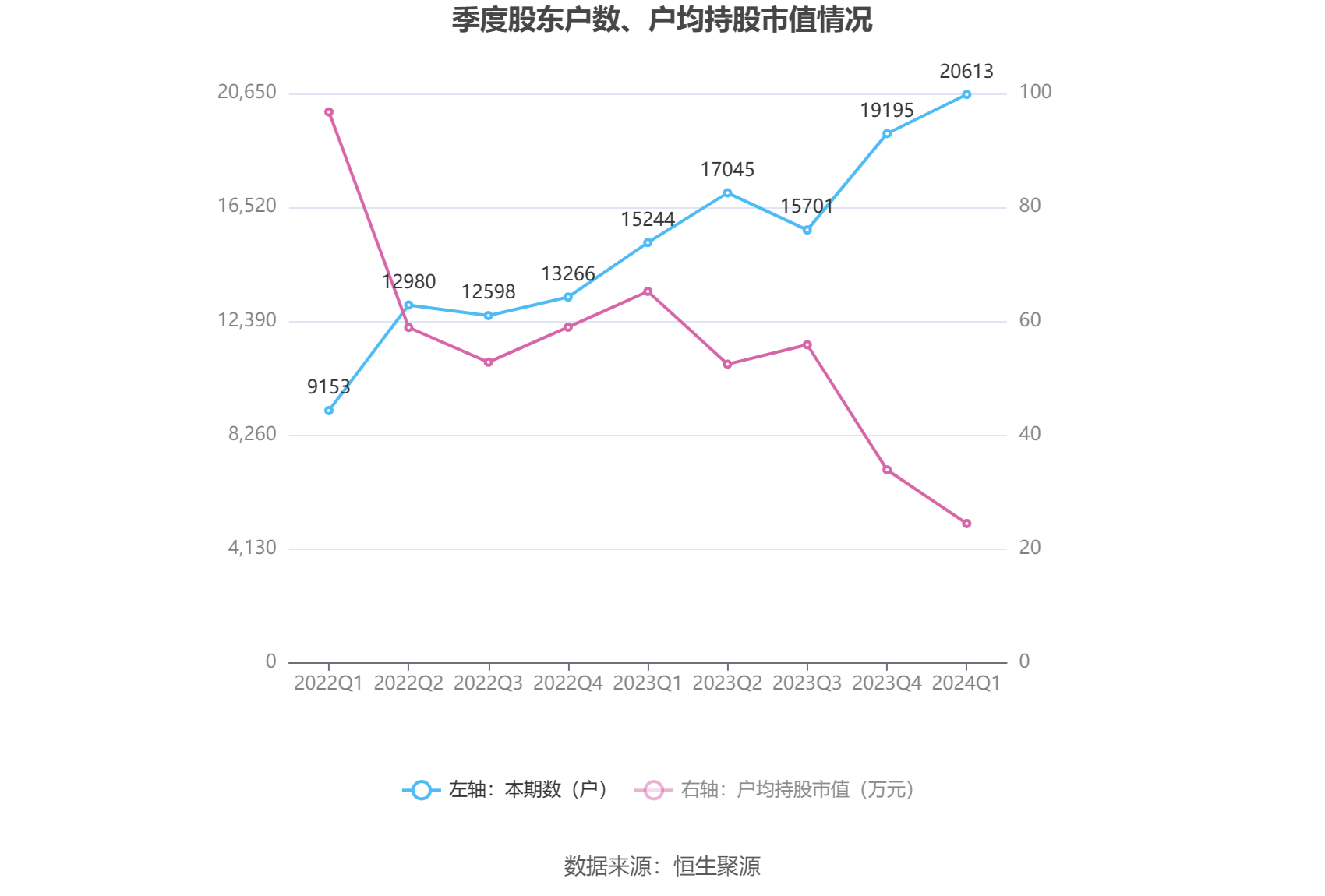 筹码集中度方面,截至2024年一季度末,公司股东总户数为2.06万户,较上年末增长了1418户,增幅7.39%;户均持股市值由上年末的33.90万元下降至24.48万元,降幅为27.79%。