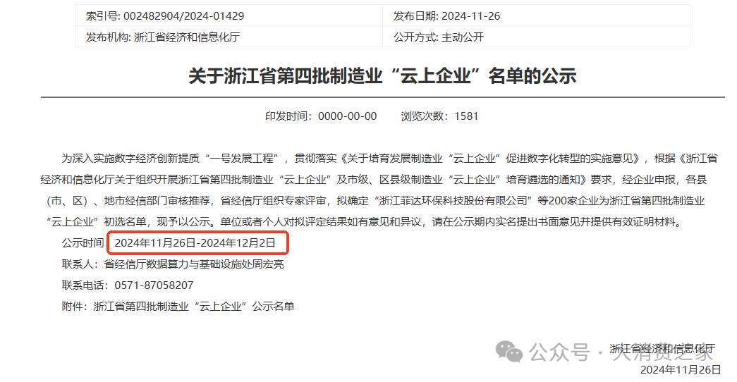 12月23日,认证主体为浙江寿仙谷医药股份有限公司(以下简称:寿仙谷)的公众号“寿仙谷医药”发文宣布,公司已被列入浙江省第四批制造业“云上企业”的初选名单。然而,这一消息实际上最早在2024年11月26日就已发布,并且公示期为一周,自2024年11月26日开始至2024年12月2日结束。对于企业而言,这种延迟的公告是否属于失误,或者背后有其他原因,值得进一步探讨。