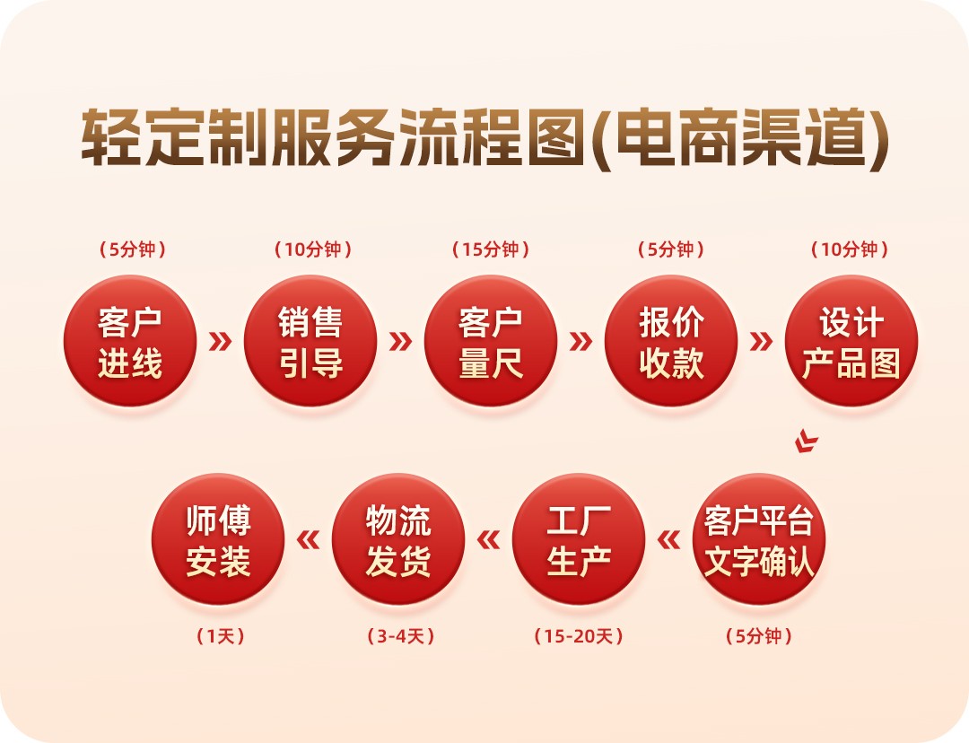 好莱客于2025年7月正式推出轻定制模式,将其定义为:极致的流程优化,缩短销售流程,具备单品零售价且能够B2C销售的板式柜类商品。实现「极致流程+短周期+透明化」的家居定制新模式。相比好莱客线下定制(专车服务)高端定制服务,轻定制(特惠快车)只满足家居定制的产品需求,让单件家具也能轻松完成私人定制。