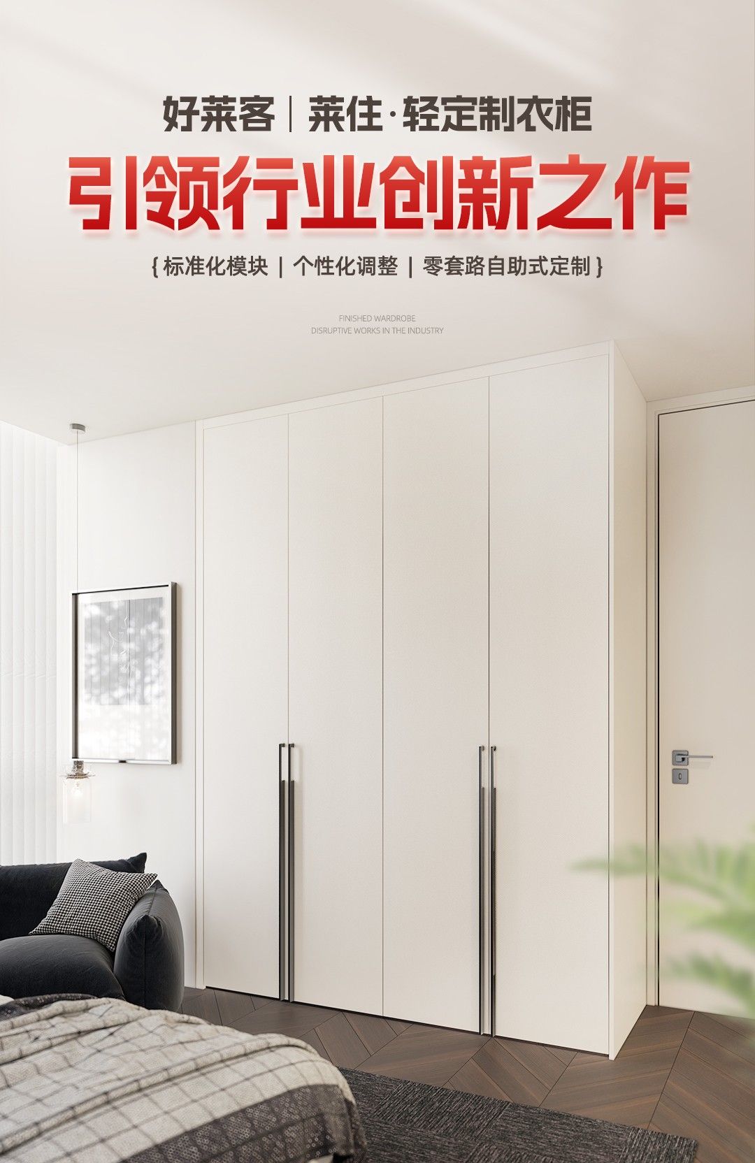 好莱客·莱住轻定制衣柜支持内部组件自由搭配,兼容多种收纳需求,搭配收边条实现严丝合缝,真正实现“零容错自助式定制”。