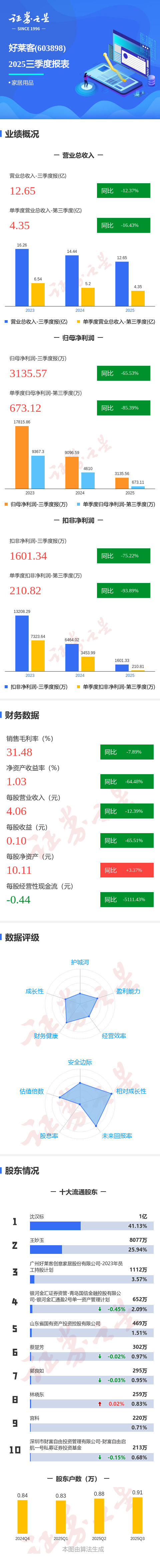 证券之星消息,好莱客2025年三季报显示,前三季度公司主营收入12.65亿元,同比下降12.38%;归母净利润3135.57万元,同比下降65.53%;扣非净利润1601.34万元,同比下降75.23%;其中2025年第三季度,公司单季度主营收入4.35亿元,同比下降16.44%;单季度归母净利润673.12万元,同比下降85.4%;单季度扣非净利润210.82万元,同比下降93.9%;负债率17.78%,投资收益1399.05万元,财务费用1978.11万元,毛利率31.48%。