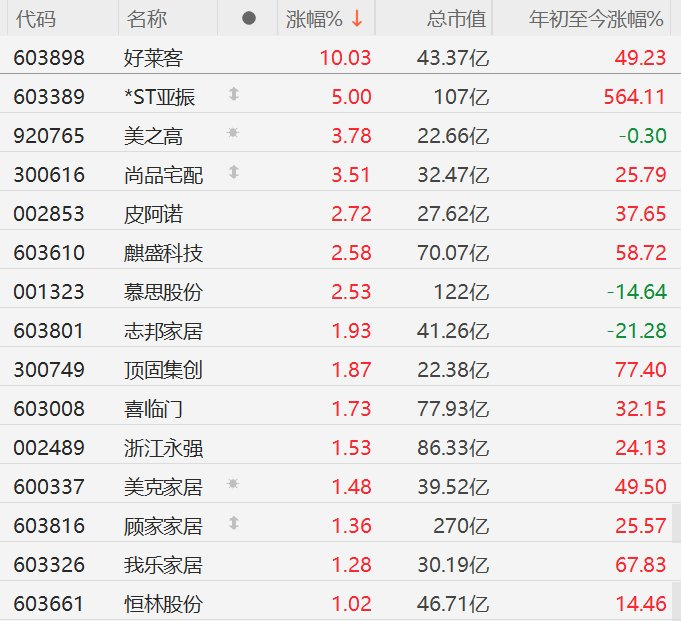 格隆汇12月2日|A股家具板块普涨,其中,好莱客10CM涨停,*ST亚振涨5%涨停,美之高、尚品宅配涨超3%,皮阿诺、麒盛科技、慕思股份涨超2%。