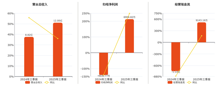公司营业总收入为12.00亿元。归母净利润为6908.82万元。经营活动现金净流入为9143.16万元。