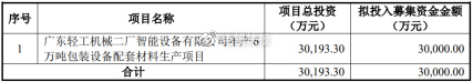 根据《以简易程序向特定对象发行A股股票预案》,永创智能拟向特定对象发行股票募集资金总额不超过3亿元,只有一个投向,即“广东轻工机械二厂智能设备有限公司年产6万吨包装设备配套材料生产项目”。