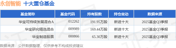 持有永创智能最多的基金为华宝可持续发展混合A,目前规模为5.12亿元,最新净值1.0183(10月29日),较上一交易日上涨1.57%,近一年上涨29.72%。该基金现任基金经理为贺喆。