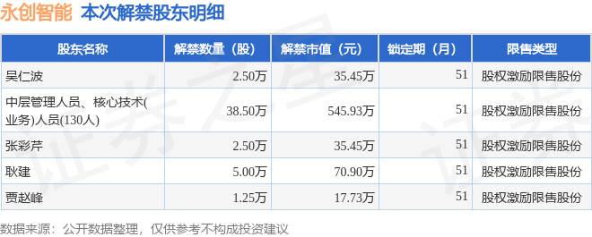 证券之星消息,根据市场公开信息整理,永创智能(603901)于1月7日将有49.75万股限售股份解禁,为公司股权激励限售股份,占公司总股本0.1%。(本次数据根据历史公告整理得出,实际情况以上市公司最新公告为准)最近一年内,该股累计解禁144.42万股,占总股本的0.29%。本次解禁后,公司还有989.64万股限售股份,占总股本1.99%。具体如下图所示: