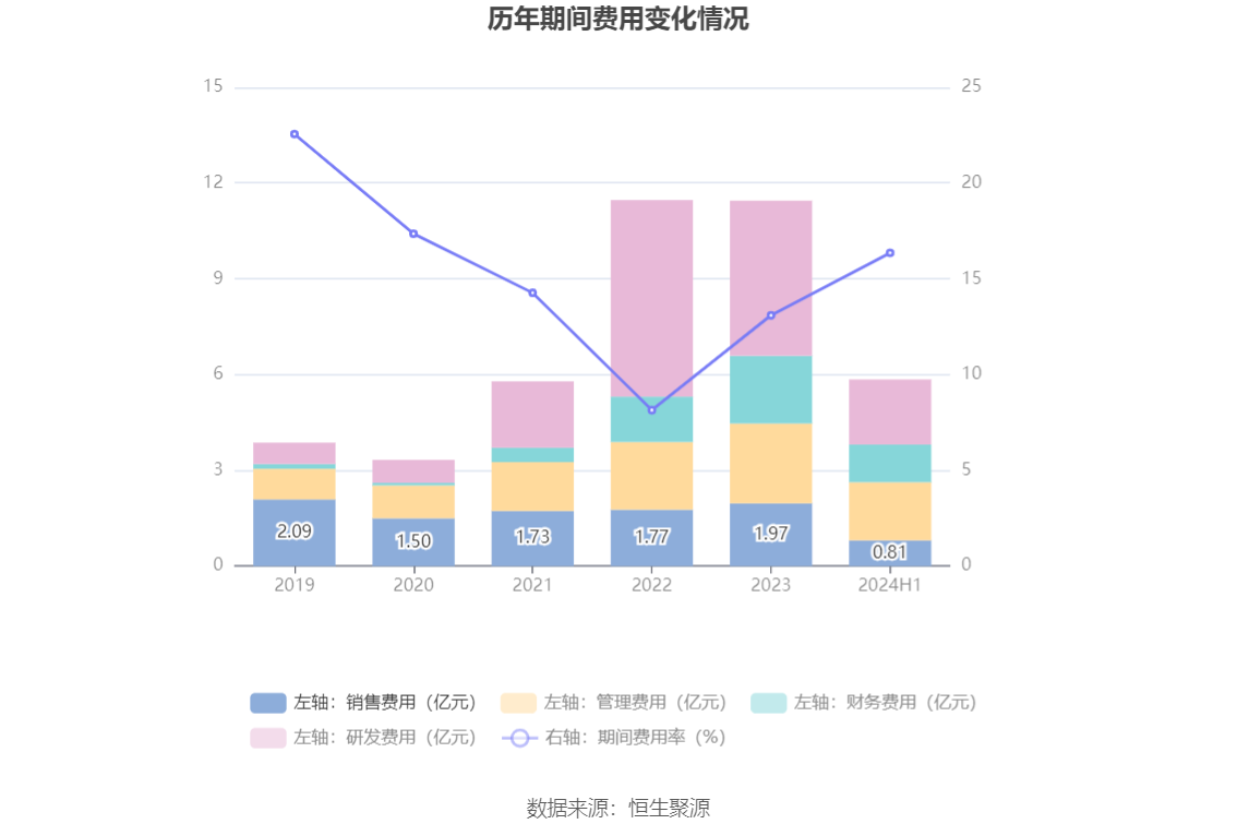 2024年上半年,公司期间费用为5.84亿元,较上年同期减少1466.74万元;但期间费用率为16.36%,较上年同期上升0.67个百分点。其中,销售费用同比下降23.67%,管理费用同比增长33.04%,研发费用同比下降23.36%,财务费用同比增长30.11%。
