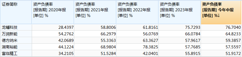 以今年上半年为例,截至6月末,湖南裕能、德方纳米等4家磷酸铁锂企业,资产负债率平均值为58.42%,其中最高的万润新能为64.82%。