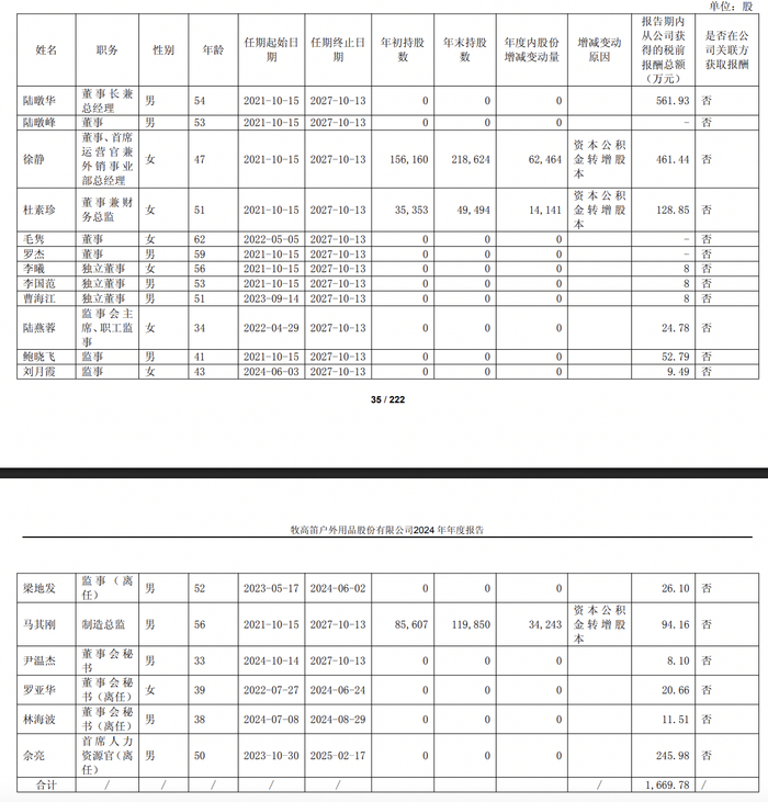 2024年,牧高笛董监高合计报酬进一步升至1669.78万元。其中,陆暾华报酬涨至561.93万元,徐静报酬涨至461.44万元,杜素珍报酬涨至128.85万元。但是马其刚薪酬则下降至94.16万元。