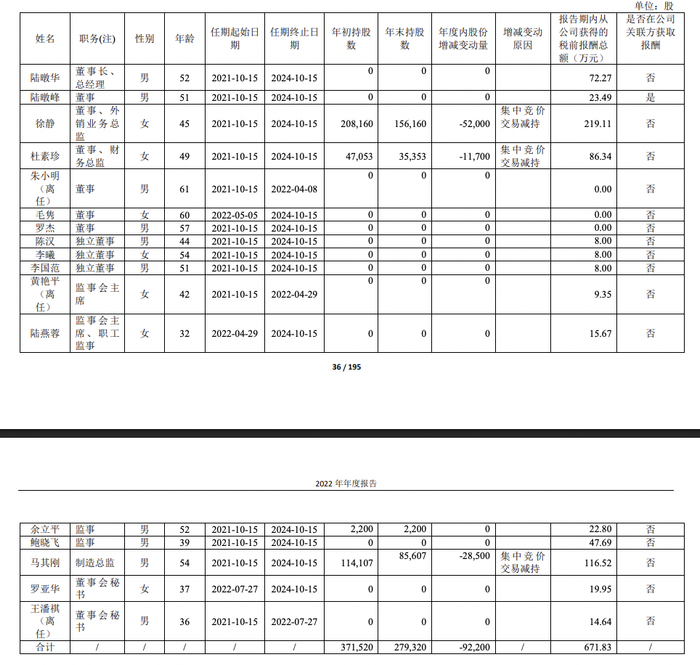 薪酬方面,2022年,牧高笛董监高合计报酬为671.83万元。其中,董事长、总经理陆暾华报酬为72.27万元,董事、外销业务总监徐静报酬为219.11万元,董事、财务总监杜素珍报酬为86.34万元,制造总监马其刚报酬为116.52万元。