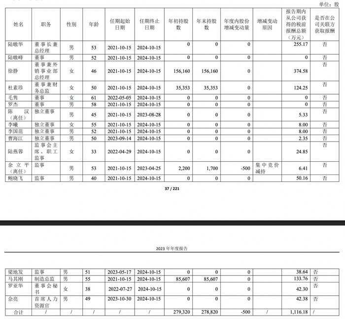 2023年,牧高笛董监高合计报酬增至1116.18万元。其中,陆暾华报酬涨至255.17万元,徐静报酬涨至374.58万元,杜素珍报酬涨至124.25万元,马其刚报酬涨至133.76万元。
