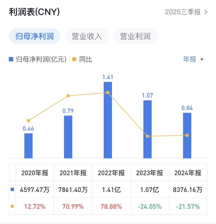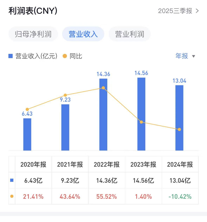 拉长时间来看,2020年至2024年,牧高笛营业收入分别为6.43亿元、9.23亿元、14.36亿元、14.56亿元、13.04亿元;归母净利润分别为4597.47万元、7861.4万元、1.41亿元、1.07亿元、8376.16万元。