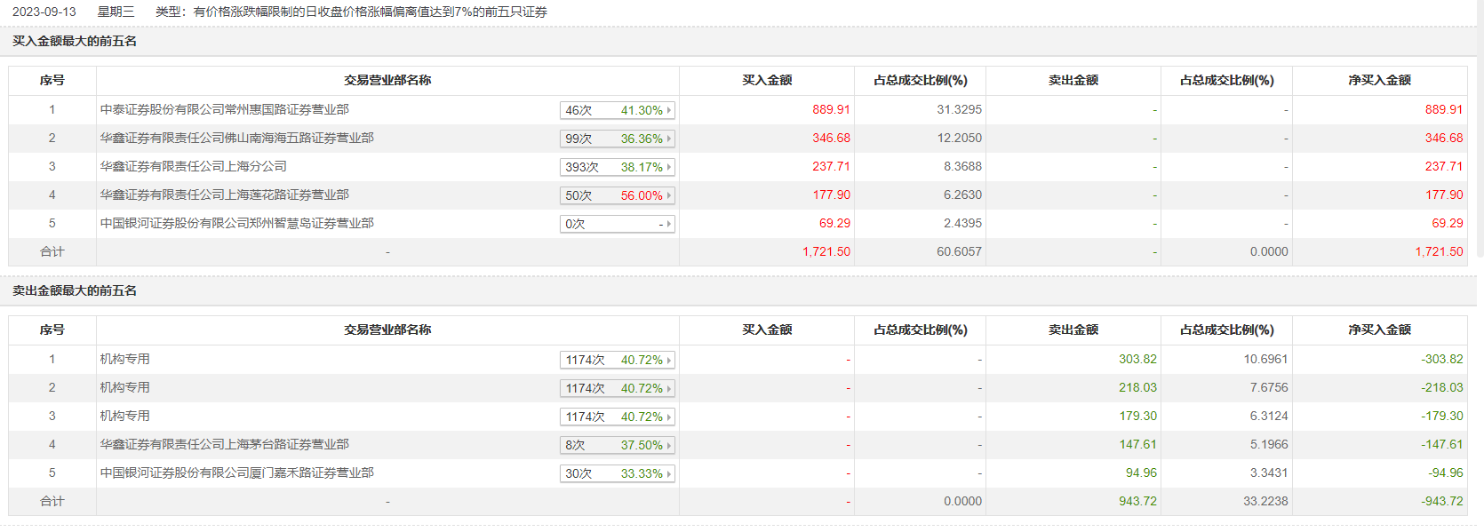 中泰证券常州惠国路证券营业部、华鑫证券佛山南海海五路证券营业部分别买入889.91万元、346.68万元;炒股养家(华鑫证券上海茅台路证券营业部)、
