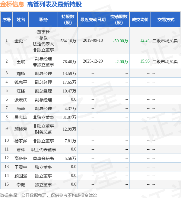 金桥信息的高管列表及最新持股情况如下: