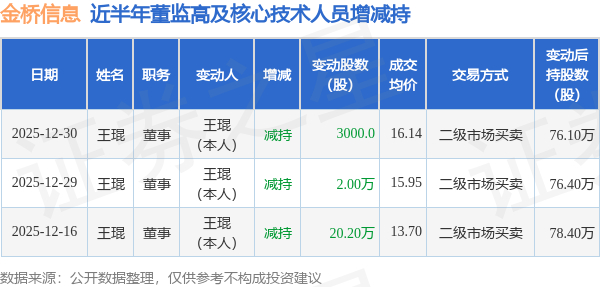 证券之星消息,根据12月31日市场公开信息、上市公司公告及交易所披露数据整理,金桥信息(603918)最新董监高及相关人员股份变动情况:2025年12月30日公司董事王琨共减持公司股份3000.0股,占公司总股本为0.0008%。变动期间公司股价下跌1.14%,12月30日当日收盘报15.67元。