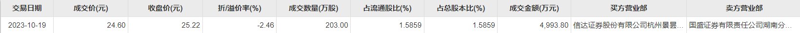 今日大宗交易成交203万股,成交额4993.8万元,占当日总成交额的45.91%,成交价24.6元,较市场收盘价折价2.46%。