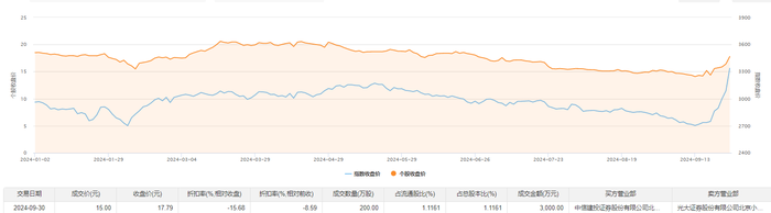 9月30日大宗交易成交200万股,成交额3000万元,占当日总成交额的28.82%,成交价15元,较市场收盘价17.79元折价15.68%。