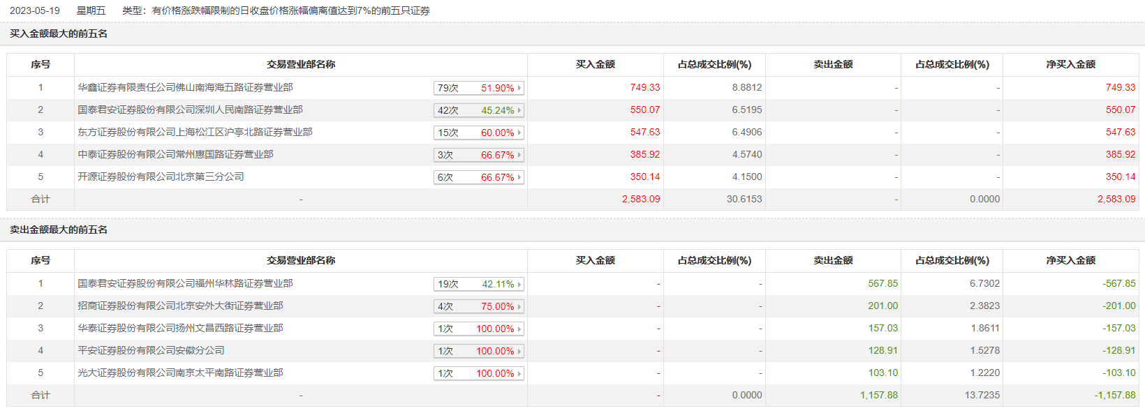 具体来看,华鑫证券佛山南海海五路证券营业部、国泰君安证券深圳人民南路证券营业部分别买入749.33万元、550.07万元;国泰君安证券福州华林路证券营业部、招商证券北京安外大街证券营业部分别卖出567.85万元、201.00万元。