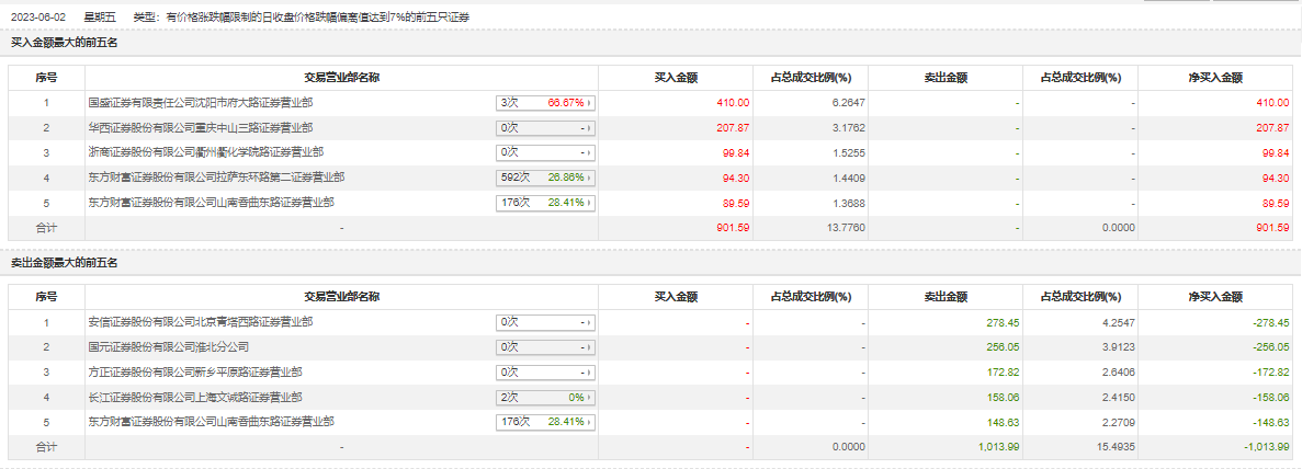 具体来看,安信证券北京青塔西路证券营业部、国元证券淮北分公司分别卖出278.45万元、256.05万元;国盛证券沈阳市府大路证券营业部、华西证券重庆中山三路证券营业部分别买入410.00万元、207.87万元。