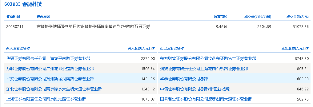 具体来看,华福证券上海宛平南路证券营业部、万联证券广州花都公益路证券营业部分别买入2374.00万元、1508.64万元;东方财富证券拉萨东环路第二证券营业部、瑞银证券上海花园石桥路证券营业部分别卖出3748.30万元、805.81万元。