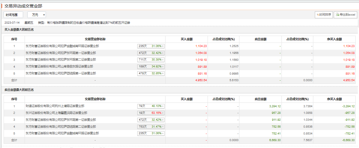 具体来看,财通证券杭州上塘路证券营业部、东兴证券上海肇嘉浜路证券营业部分别卖出3294.12万元、957.28万元;东方财富证券拉萨金融城南环路证券营业部、东方财富证券拉萨东环路第一证券营业部分别买入1104.23万元、1054.08万元。