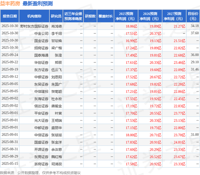 东吴证券股份有限公司朱国广,冉胜男,苏丰近期对益丰药房进行研究并发布了研究报告《2025年三季报点评:盈利稳健,看好提质增效及多元化门店布局》,给予益丰药房买入评级。