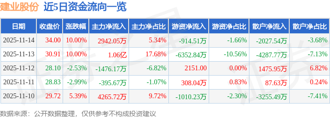 证券之星消息,建业股份11月14日涨停收盘,收盘价34.0元。该股于9点48分涨停,未打开涨停,截止收盘封单资金为5164.63万元,占其流通市值0.93%。