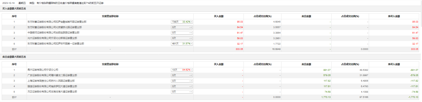 12月14日,雪龙集团今日跌停,全天换手率达0.42%,振幅达0%。龙虎榜数据显示,营业部席位合计净卖出1467.08万元。其中,甬兴证券有限公司宁波分公司、广发证券福州望龙二路证券营业部分别卖出881.07万元、579.05万元;东方财富证券拉萨金融城南环路证券营业部、东方财富证券北京望京北路证券营业部分别买入85.03万元、64.54万元。